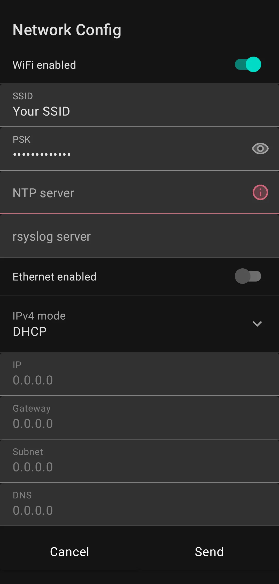Navigate to Settings > Network: Turn on the slider for WiFi enabled - Enter your SSID and PSK for your network - Tap Save
